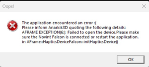 Anarkik3DDesign Version 3.1 is generally ‘plug and play’ with no need to download Falcon drivers (as we have embedded these into the software). But computer operating systems are all different and get updated. We recommend downloading up-to-date drivers for the Falcon from here and installing/activating the drivers (Novint Falcon drivers – setup.Falcon.v4.0.28.0_100707.exe) before plugging in the Falcon.